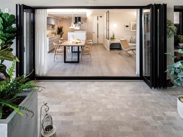 フルオープンサッシを開放すると、リビングと一体になり、さらに広々とした大空間に。