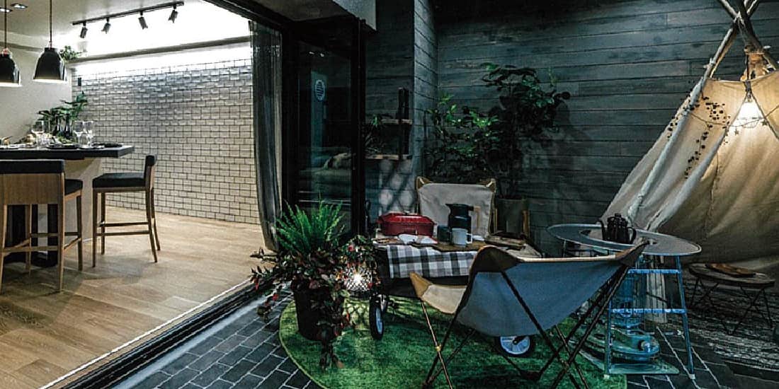 バルコニーにテントをセット、キャンプグッズを並べてべランピングを楽しめます。
